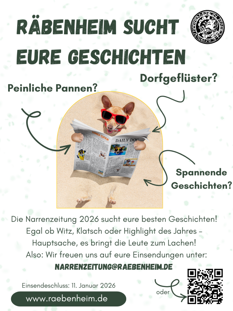 Hast du eine lustige, skurrile oder einfach nur typisches Ereignis in Räbenheim erlebt? Genau solche Geschichten wollen wir! Ob peinliche Pannen, urkomische Begegnungen oder unerwartete Skandale – die Narrenzeitung 2026 sucht die besten Beiträge aus Räbenheim.